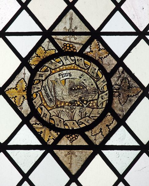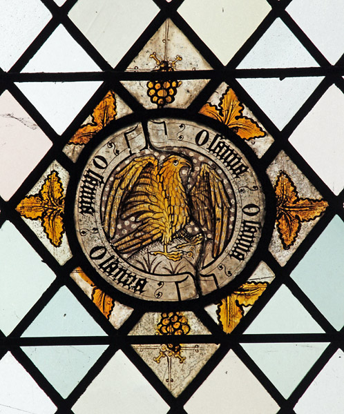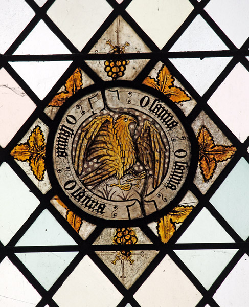 Top Left: What appears to be a white eagle, but could be a caladrius. A caladrius is a white bird from Roman mythology which was said to be able to take up any sickness in humans and fly away to disperse it, curing both the human and itself. The label above reads "Cantemus dno glrose". The second is clearly a contraction of "domino". The third word may simply be a typo and probably should read "gloriose": Cantemus domino gloriose (Sing to the lord).