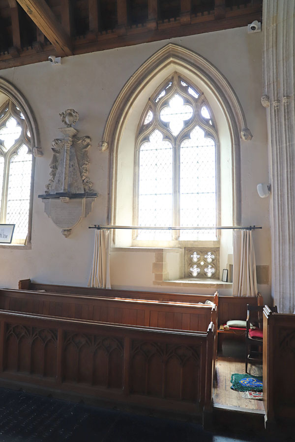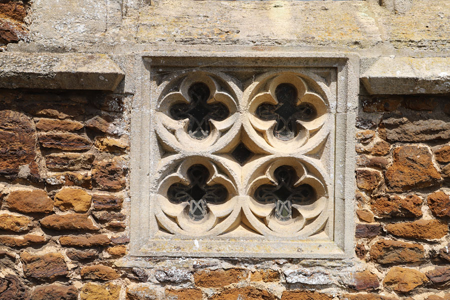 General view of the north side of the chancel, with the low side window, more elaborate than its south side counterpart, and very close to the western end of the chancel. This was likely installed in the mid c14. The two three-light Perpendicular windows were probably installed much later. It is possible that this low side window was installed in the original c13 chancel prior to the c14 re-building, and may pre-date the low window on the south side. Internally the north opening is deeply splayed, particularly towards the east and is unadorned, while the south opening has a finely carved lintel. This also points to the north window pre-dating that in the south. See next slides...