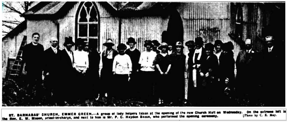 Percy and Clara Bacon were congregants at St Barnabas, and Percy a churchwarden until his death in 1935, but when they moved to Caversham in the summer of 1923 Emmer Green was without a permanent church building. Although St Barnabas's parish had been formed, all services were conducted in the unconsecrated village hall, a corrugated iron hut which still lies just to the east of the present church. The village hall was refurbished in 1925, and at the opening ceremony in November of that year Percy Bacon who had performed the opening ceremony was pictured along with a group of helpers and the incumbent of St Barnabas. Three designs for the new church were commissioned and the parishioners voted for their preference1. Eschewing the grandeur of the gothic revival structures of the last century which were no longer affordable or desirable, this design was for a simple, rectangular, brick building consisting of nave, chancel and west porch but without a tower. The design chosen reflected a good deal of modern thinking on ecclesiastical architecture, particularly in the lightness of the interior, the nave having 4 large plain glass windows along each of the north and south walls, freeing it from gloom even on an overcast day. Another pressing factor for choosing a simple design was that money was tight. The First World War was still fresh in people's minds, and doubtless played a part in depleting the coffers of potential wealthy donors. Although the Great Depression of the late 20s and early 30s was still a few years off, people's perception of the appropriateness of spending exorbitant sums after such a cataclysmic event may have dented their enthusiasm for such excess.