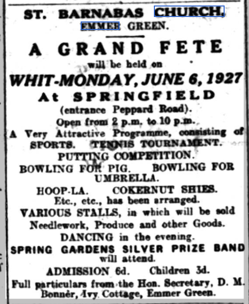 fund-raising events such as fetes, and contributions from the growing congregation of the area. In the first phase of the building only the nave was completed, but even then there was an outstanding debt of £800.3 The chancel would have to wait. From 1925 annual fund raising fetes were organised, and Percy and Clara Bacon would often host the events at their home "Springfield"