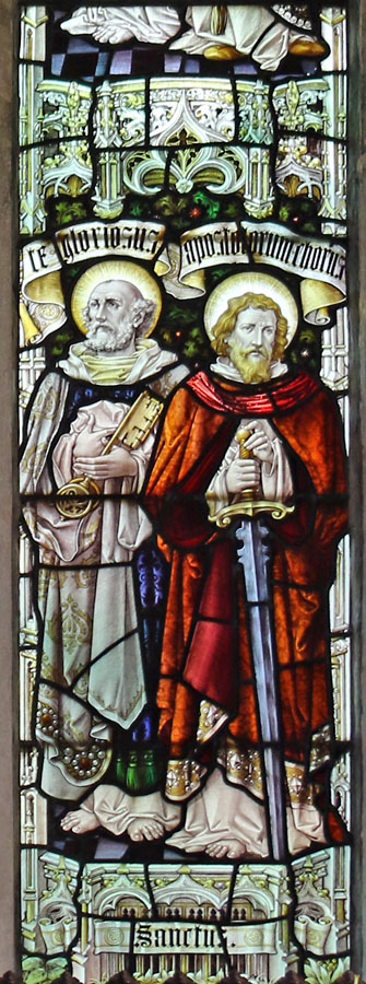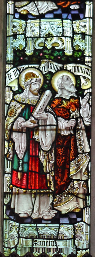 Ruth Sharville on her website devoted to the works of George Fellowes Prynne suggests he worked at St Michael's around 1906, but with the exception of the east window, the exact nature of the work undertaken is uncertain. The Builder article of 25th August 1906 simply states that the work was executed by Percy Bacon & Brothers under the supervision of Prynne.1This tall three-light window with simple Y-tracery is filled with Percy Bacon and Brothers glass in his classical style. The central subject is Christ in Majesty surrounded by saints and prophets. To Christ's right; the Virgin Mary and St John the Evangelist, and to his left St Joseph and St Mary Magdalene. Beneath Christ the standing figure of the Archangel Michael in classic pose with sword and shield, the slain dragon at his feet symbolising the defeat of evil. To Michael's right stand Moses and Isaiah, and to his left St Peter and St Paul. The words in the scrolls above the saints' heads are from the Te Deum.