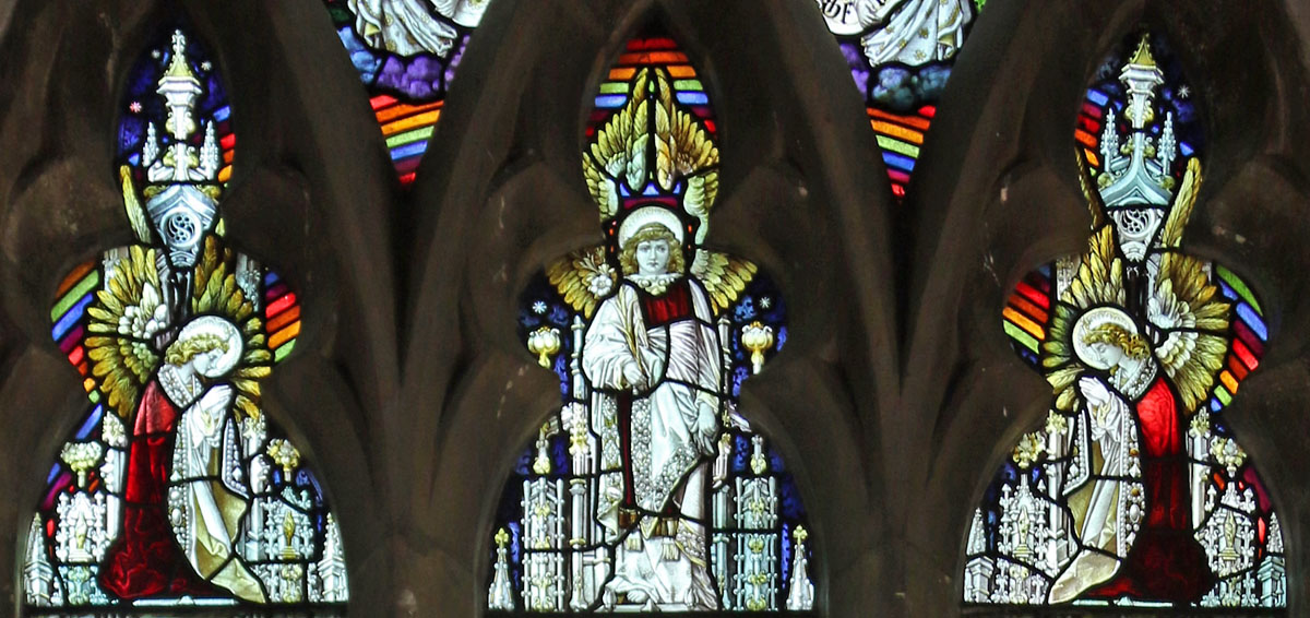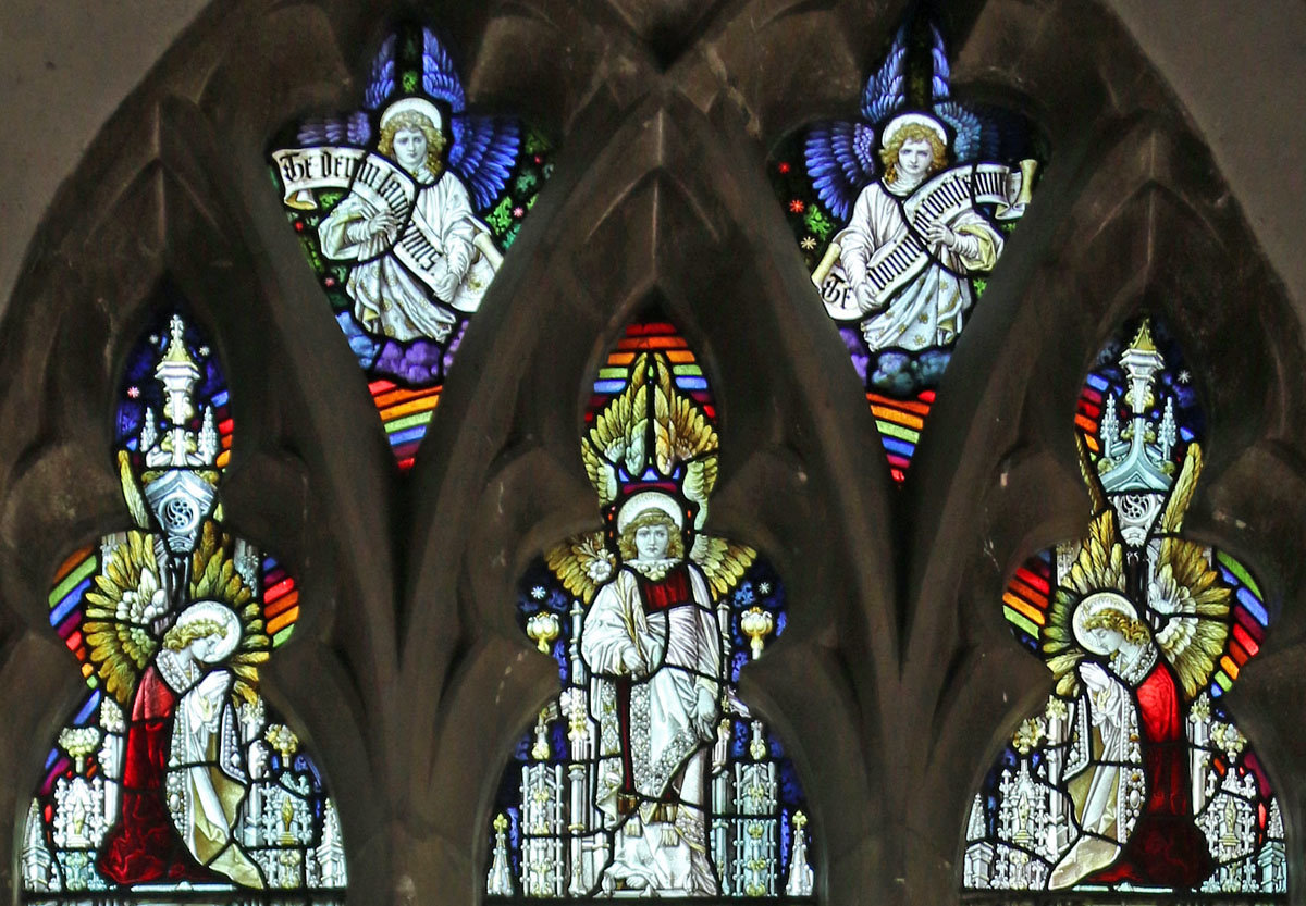 At the top of the lights angels are depicted kneeling in prayer and the central figure of Gabriel holding a white lily. All are surrounded by a rainbow. In the tracery two more angels hold scrolls with the first line of the Te Deum, "Te Deum laudamus: te Dominum confitemur".