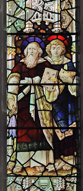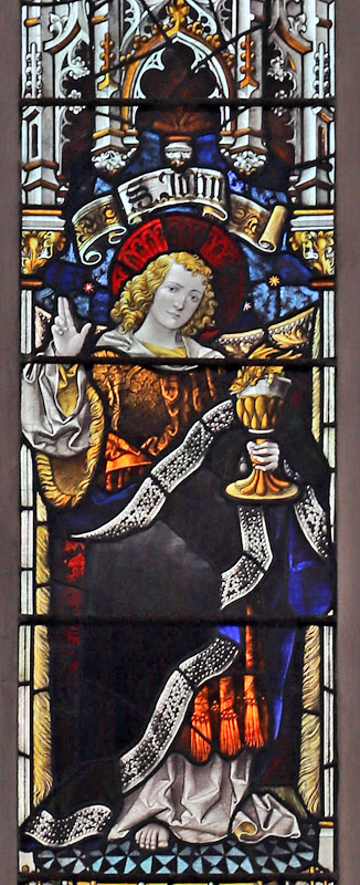 The earliest of the Bacon windows installed in 1899 represents St James the Great, St John Evangelist and St Matthew Evangelist. The full length figures are presented in their elaborate niches of white glass and yellow stain. The central figure of St John stands on a tall pedestal around which a scroll os wrapped with the words, "That disciple whom Jesus loved". This design was continued in the two other Bacon windows installed in the south aisle of St Andrew's in 1913 and 1925.