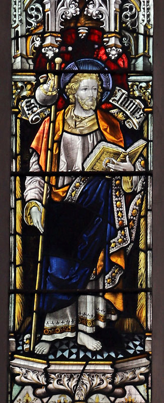 At the time of the installation of this window, the scheme of windows depicting the Apostles and Evangelists was almost complete with only St Simon, St Matthias and St Jude missing. This was corrected by Percy Bacon's third visit with a window of 1925 installed to the left of this one.