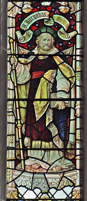 Installed in 1925 from the studio of Percy Bacon Limited, the aperture for this window is identical to that of SA3 and Bacon has used the same design, with some minor variations and colour scheme. The niches are not as elaborate, and the colouring is green rather than yellow. The central figures of Simon & Jude crowd the single pedestal which like SA3 extends to the base of the window. It is clear that the window has been modified over the years to include an additional dedication, the most recent an inscription beneath St Matthias which reads, "In memory of Richard T Robins who read the lessons in this Church for 55 years. Died Dec 8th 1933 aged 87". This replaces the original inscription reported in the local press5 at the dedication of the window which read, "He was numbered with the eleven Apostles". The window was originally dedicated to Henry Wilson Robinson, Vicar of St Andrews for 35 years. The Rev. Robinson had expressed a wish to memorialise the local head teacher, and his name appears on the inscription in the left light.