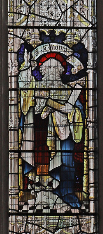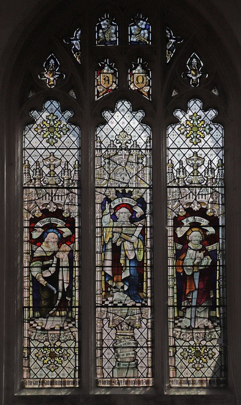 Installed in 19134 the window depicts Ss Bartholomew, Thomas and James. Each holds an implement symbolic of their trade or martyrdom; St Thomas a carpenter's set square, Bartholomew is represented holding a knife, symbolic of the tradition that he was flayed alive, and James holds a saw suggestive of the manner of his death by being sawn in half. Thomas stands on a tall pedestal around which is wrapped a scroll with the words quoting John 20;29: "Blessed are they that have not seen, but have believed". The windows is mostly white glass and yellow stain making up the elaborate niches in which the figures stand. The design is in keeping with the other Bacon windows in St Andrews. The window was given by Eliza Robins and is dedicated to her sister, Flora who died 15th July 1911. Eliza is remembered in the south chapel window (see below).