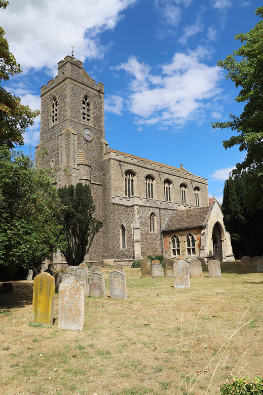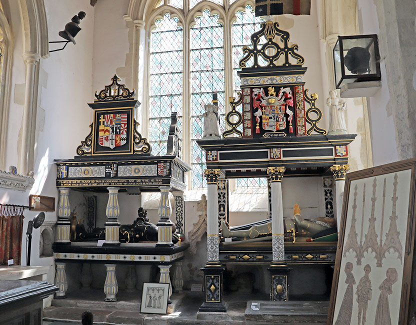 The 14th and 15th century church is large and extravagant, faced with flint, with a tall and imposing clerestory with large perpendicular openings over both aisles, perhaps a little out of proportion with the lower windows, but having the advantage of providing the interior with lots of light. There is architectural detail in spades; the spandrels between the arches of the arcades are carved and adorned with coats of arms above which a simple frieze and turned molding delineates the start of the clerestory. The church is filled with the remains of the Peyton family whose polychrome mausoleums and grave slabs clutter the side chapels.