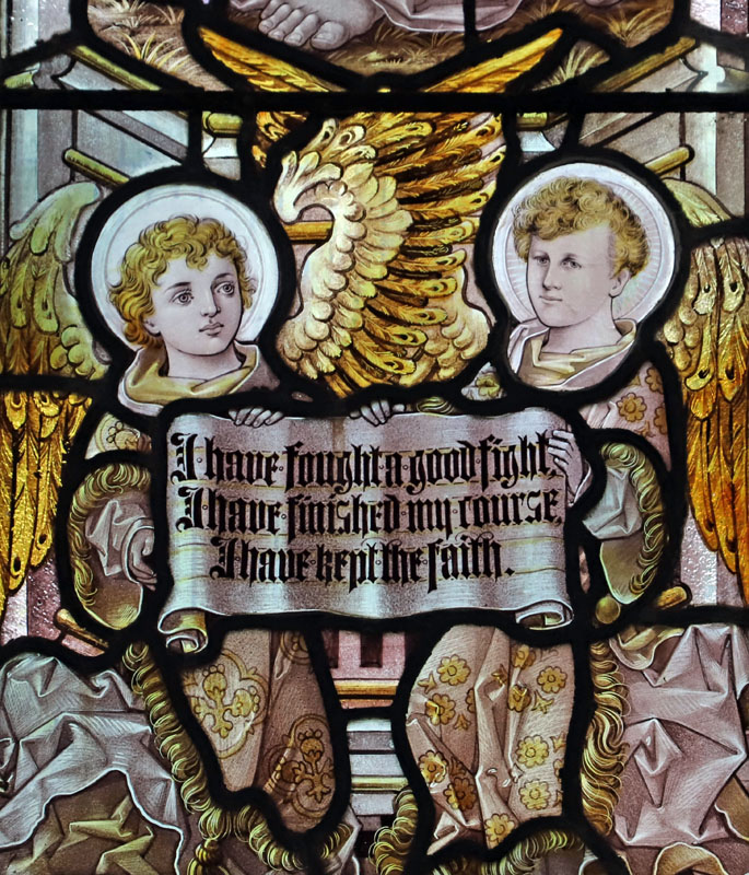 One of Percy Bacons aspirations was to provide church interiors with harmonious decoration. With peicemeal insertion of windows over many years, and using different artists and great varience of subject matter, this aspiration was rarely achieved. In St Cuby's, however, the Bacon Studios have managed to create, in one part of the church, a harmony between adjacent windows in the south wall of the chancel. The openings in the south chancel 1 window are virtually identical to those in the adjacent window (SC2). Although inserted eight years apart, Bacon has retained the very essence of the style of the 1894 window. He has also included two cherubs at the base of the centre light one of which is clearly likenesses of a real person (possibly a child or grandchild of the dedicatee, Canon Paul Bush). The cherubs hold a scroll with a quote from 2 Timothy 4:7-8: