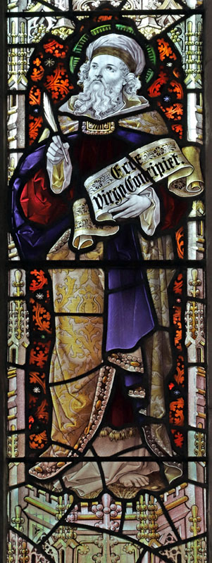 The window, of three lights, depicts, King David, St Paul and the Prophet Isaiah. Each stands on a pedestal under an elaborate architectonic niche. Demi-angels above David and Isaiah hold scrolls with their names. In the simple tracery are white doves descending.