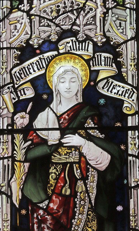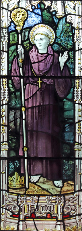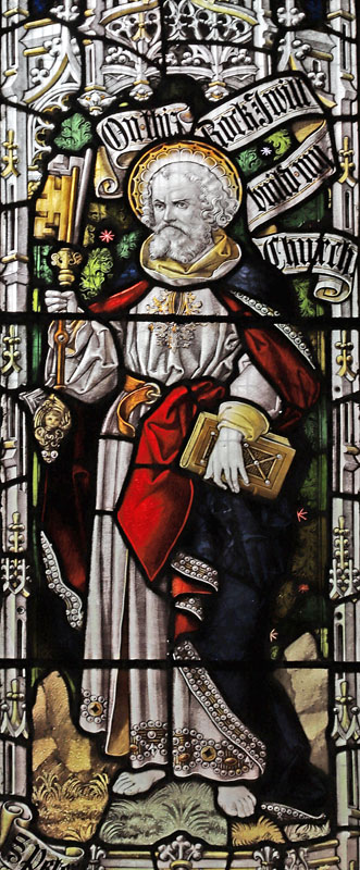 The window was placed in the south wall to honour the fiftieth year of Canon Paul Bush's ministry at St Cuby's, Duloe, and dedicated on the 14th October 19001. The window cost £60 which was paid by donations received from members of the congregation. The subjects, for which advice was sought from Prebendary Hineston-Randolph rector of Kingmore, Devon, are The Blessed Virgin Mary, St Cuby and St Peter. St Cuby (or Cybi) was a the son of Salomon, King of Cornwall. Cuby renounced his crown and, forsaking the pagan worship of his fellows, embraced Christianity and became a devout teacher. Cuby is represented in this window as a tonsured monk, dressed in a simple habit, and holding a golden crozier in his right hand, with his left raised in benediction. His relinquished crown sits at his feet. In the background is a representation of Stonehenge, symbolic of Cuby's conversion away from Paganism. Above the Virgin Mary a scroll reads, "For generations shall call me blessed", and above Peter, "On this Rock I shall build my Church".