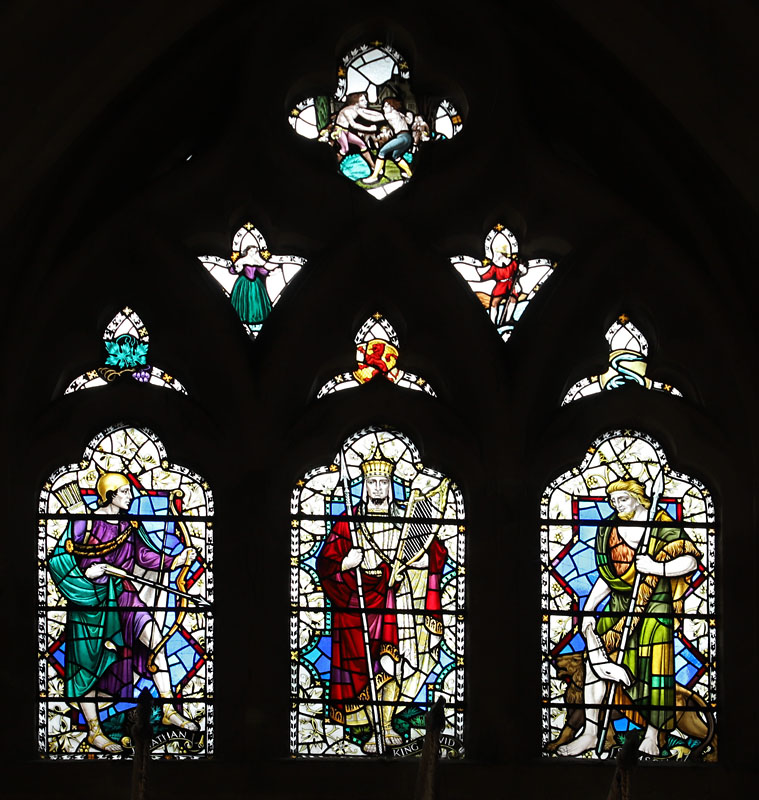 The window which is above the west entrance (north side), was of three lights and depicted the standing figures of Jonathan, David and Samson. These were suggested as symbolic of the attributes of the character, John Ridd the hero in R. D. Blackmore's seminal work, "Lorna Doone" - namely, Love and Tenderness, Courage and Strength, though it is not entirely clear who was the originator of the idea.3 Beneath the window a marble tablet (photo above) in high relief by Harry Hems of Exeter was erected. The window and tablet were unveiled by Mr Eden Phillpotts on 26th April 1904.4