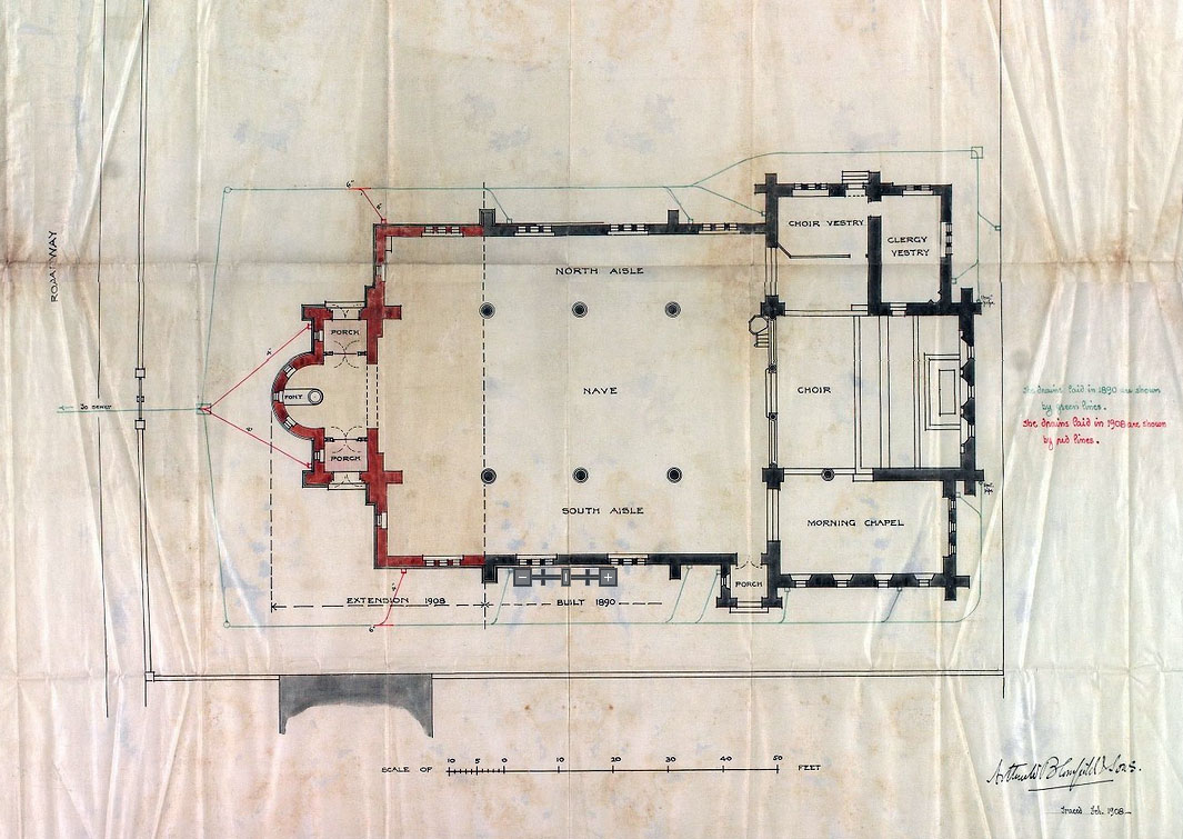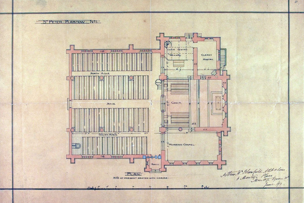Like many churches built to serve the growing population of London in the 19th century, St Peter’s is a story of rise and fall. The church originated as a mission chapel in Pelly Road in connection with St Mary’s. Services were held in a barn, and then an iron church licenced in 1877, but it was not long before this proved entirely inadequate for the needs of the district.1 Plans were put in place to construct a new church, and in 1885 the Bishop of St Albans fund purchased Upton House,2 the birthplace of Joseph Lister, the eminent surgeon, and a location for the church was allocated in the grounds just to the south of the house. The house itself was to become the vicarage and parish room. Sir Arthur Blomfield was contracted to prepare designs which were presented to and approved by the Incorporated Church Building Society in 1891.3 The plan permitted seating of 827 souls, all of which were to be free. The contract for the building works was reported to be worth £6,300, with an additional sum of £8,000 being needed to provide internal fittings and furniture. However, between the date of design approval and the laying of the foundation stone on 30th June 1892, only £4,000 had been raised, resulting in Blomfield amending the design, and reducing the overall size of the church by about a third. This was achieved by lopping off two of the western most bays of the nave and the west porch (see plan below). Further economies were made, one of which was to only provide chairs for the congregation rather than pews as in evidenced by Blomfield’s annotation on his reduced plan of June 1893. Even this exceeded the budget, the whole cost totalling £4,500, and when completed the fund was £700 in deficit.