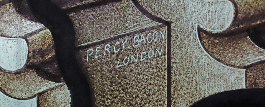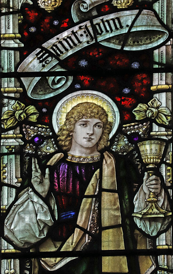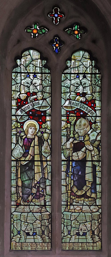 The window depicts the standing figures of St John the Evangelist and St Nicholas, each holding their symbols; St John - a chalice in his left hand while blessing with his right, and St Nicholas as Bishop holding a model of a sailing boat in his left hand and a crozier in his right. Although St Nicholas a popular subject in Eastern Orthodox iconography where he is often portrayed wearing an omniphorion and the eastern style of mitre, here he is dressed as a western bishop. The format of the window follows Bacon's usual style, with the figures standing in elaborate architectonic niches and in front of drapes tied to the columns with golden bows. The dedication reads: