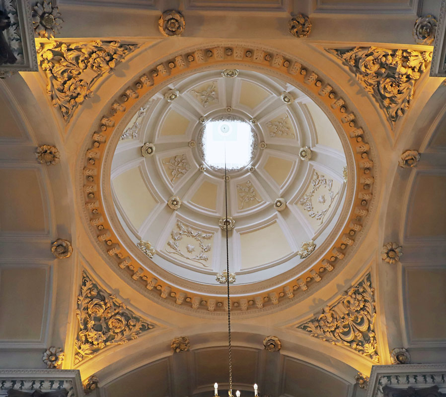 The present building designed by Henry Bell of Kings Lynn was erected in 1680 over the foundations of the larger original church whose crypt and tower were the only survivors of the fire. It is classically English Baroque in style and not unlike many churches built in London during the late 17th and early 18th centuries. It has an unusual colonnaded portico at the west end spanning almost the full width of the nave and aisles which is said to have been copied from that at St Paul's Cathedral in London. The interior is opulent and richly adorned with stucco and painted ceilings. Fluted, painted columns with gilded capitals hold the chancel arch, and the full height reredos incorporate more columns seeming to hold up the pediment. Sunbursts and gilding is everywhere. The is held in place by four enormous ionic columns and there are galleries (a later addition) above both aisles.