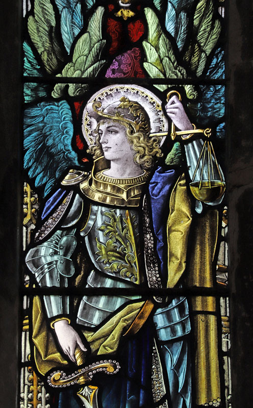 There is a single Percy Bacon window of two lights of 1898 in the north aisle which depicts the standing figures of Archangel Michael and Angel Gabriel. Both stand on chequered, ornate pedestals with wings in shades of blue and green stretching up into the narrow lights, topped by elaborate canopies. Michael dressed in armour holds a sword in his right hand and the scales of justice in his left. Gabriel holds a lily symbolic of his appearance before the Blessed Virgin at the annunciation. Click on the image right.