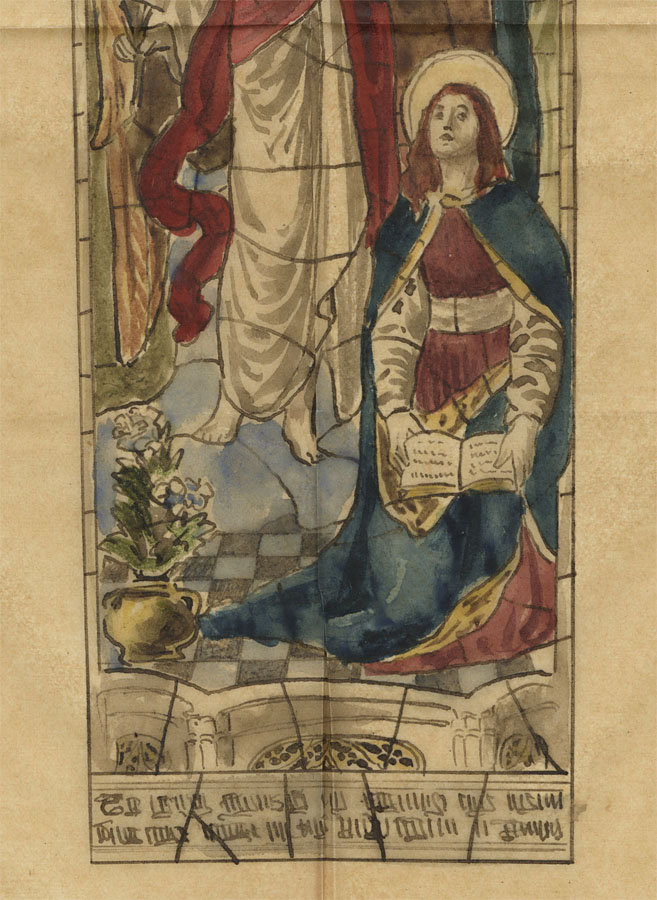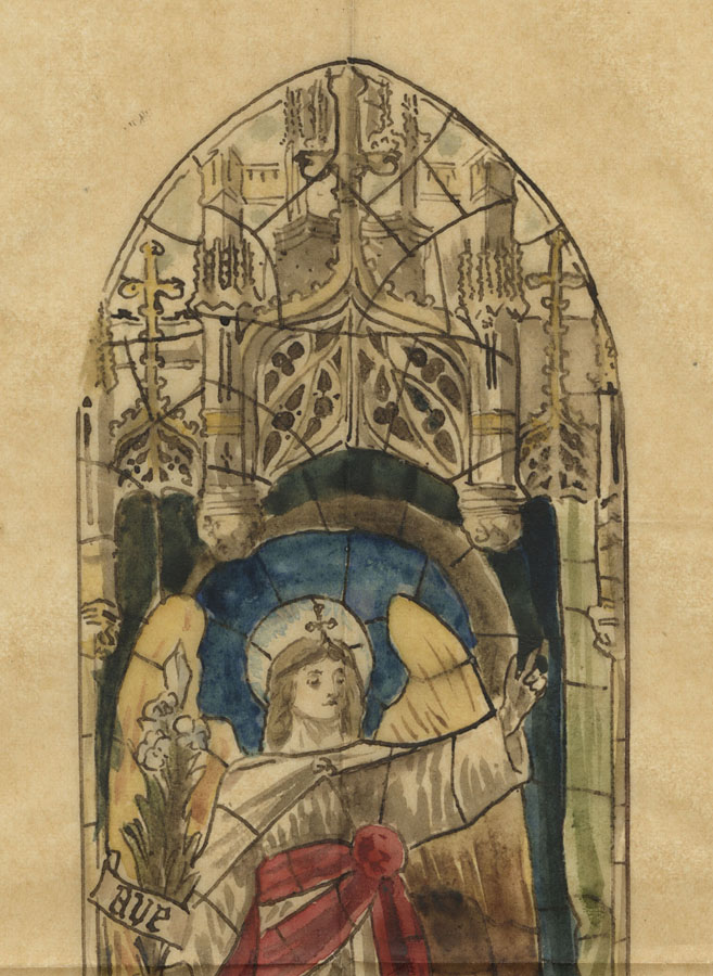 The only trace of Percy Bacon's work at St Cuthbert's is a watercolour design for a single light untraceried window with a number 2096. The subject is the Annunciation to the Virgin Mary. At the base of the design, the hand-written note of an inscription reads: